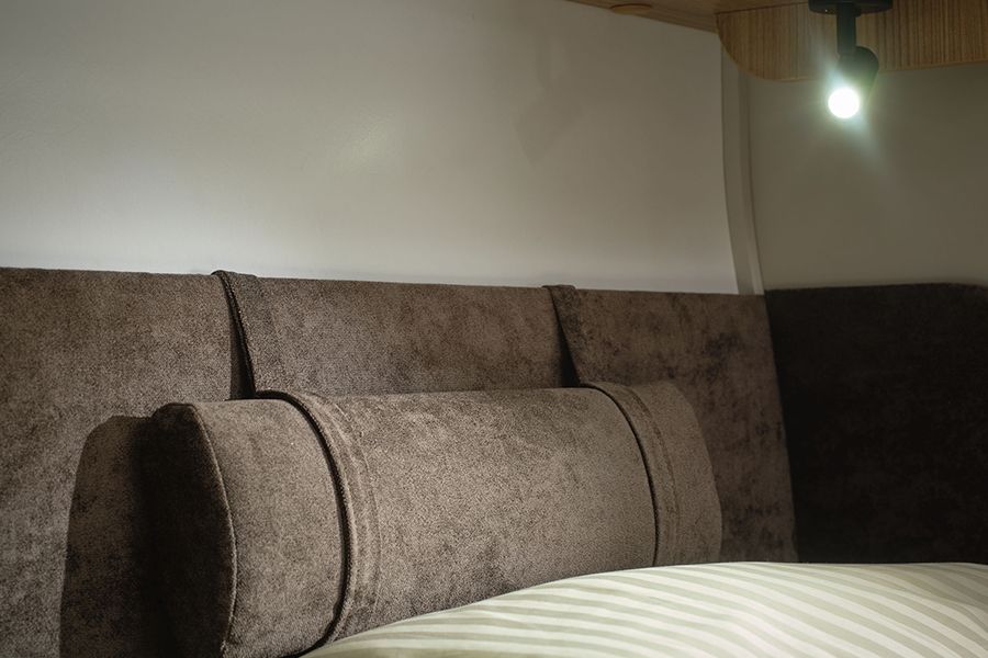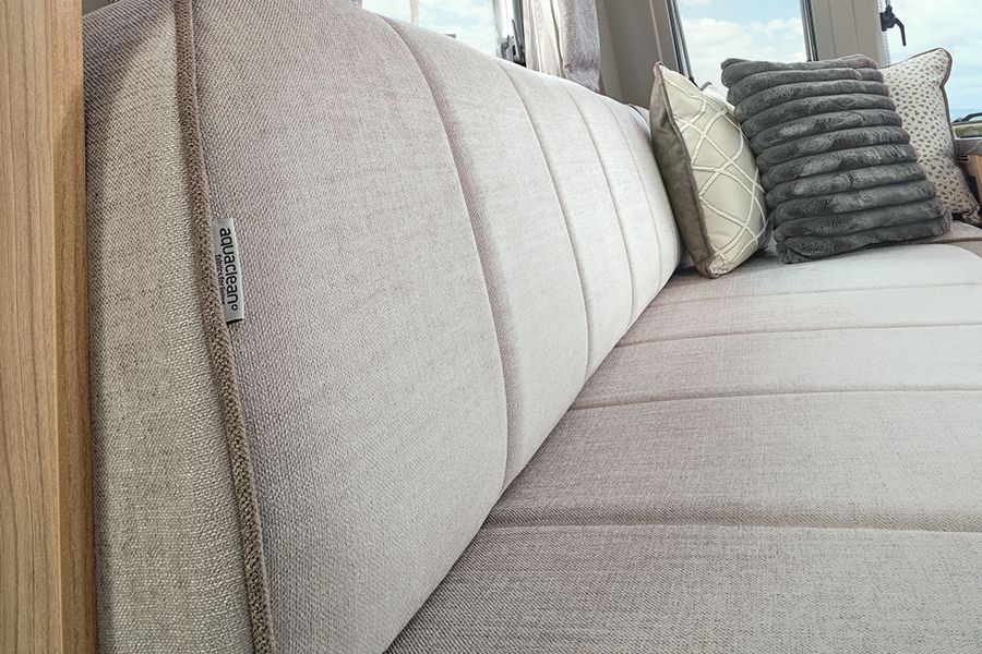 Duvara monte TV alanına sahip geniş L şeklinde ön salon (TV ücretli opsiyon olarak sunulur); çift kişilik yatağa dönüşebilir ve üç farklı kumaş seçeneği mevcuttur