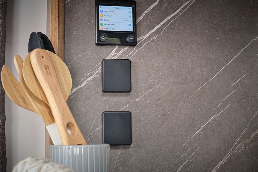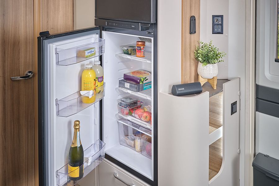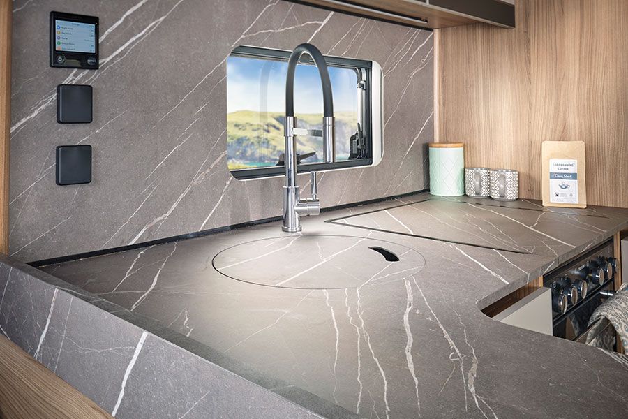 Ekstra tezgâh alanı ve depolama sunan genişletilmiş mutfak; Thetford 156L kule tipi buzdolabı ile donatılmıştır