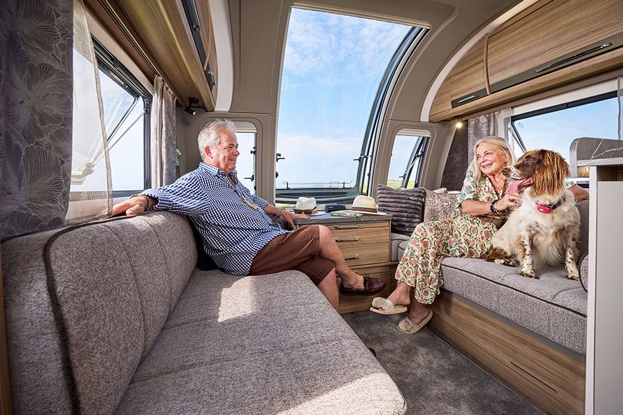 Çift akslı, 8 ft genişliğinde model; paralel oturma düzenine sahip ön salon ve arka kısımda ada tipi king-size yatak ile 4 kişiye kadar konaklama imkânı sunar