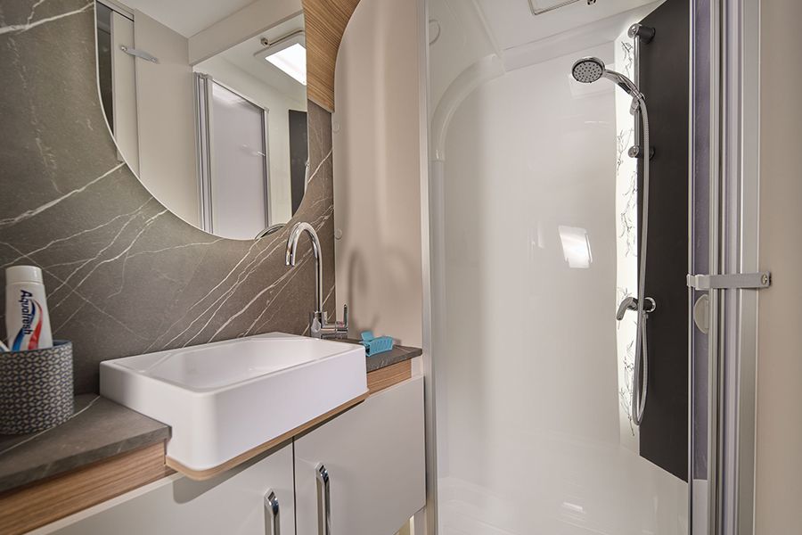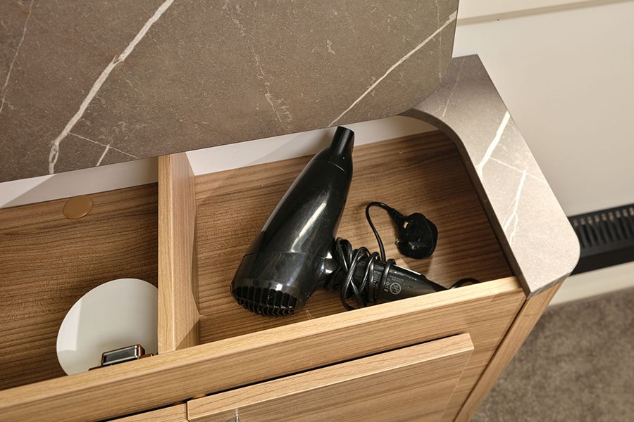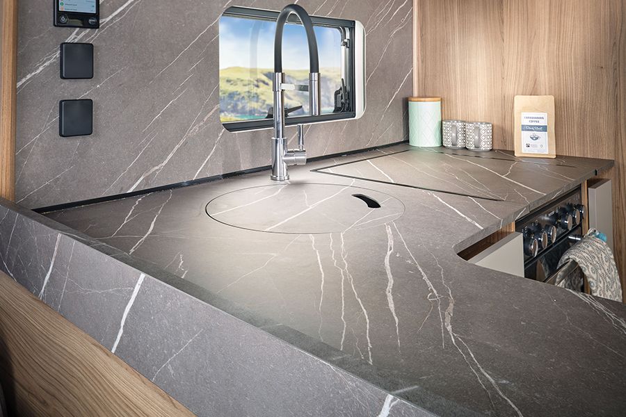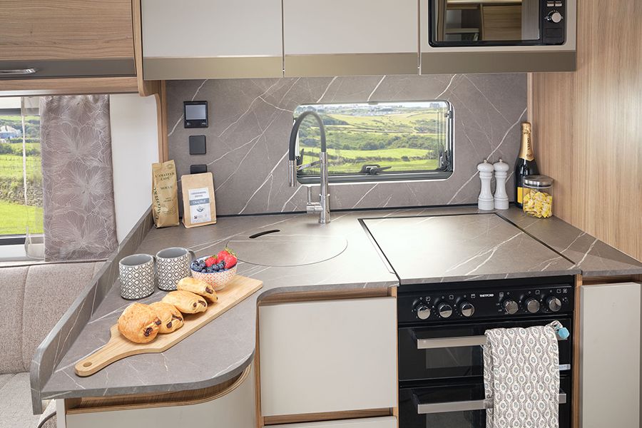Ekstra tezgâh alanı ve depolama sunan L şeklinde mutfak; Thetford 156L kule tipi buzdolabı ile donatılmıştır