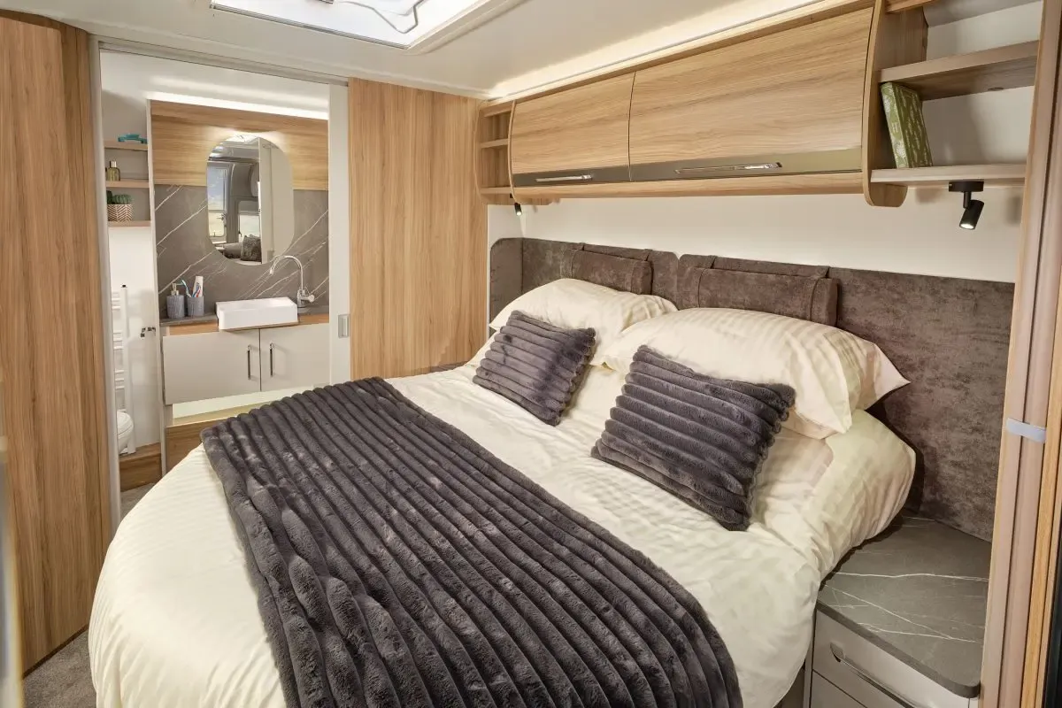 Geniş ön salon, iki tek kişilik yatağa veya bir çift kişilik yatağa dönüşebilir; üç farklı kumaş seçeneği mevcuttur