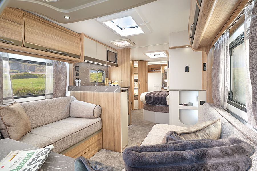 Tek akslı, 8 ft genişliğinde model; paralel oturma düzenine sahip ön salon ve arka kısımda ada tipi king-size yatak ile 4 kişiye kadar konaklama imkânı sunar