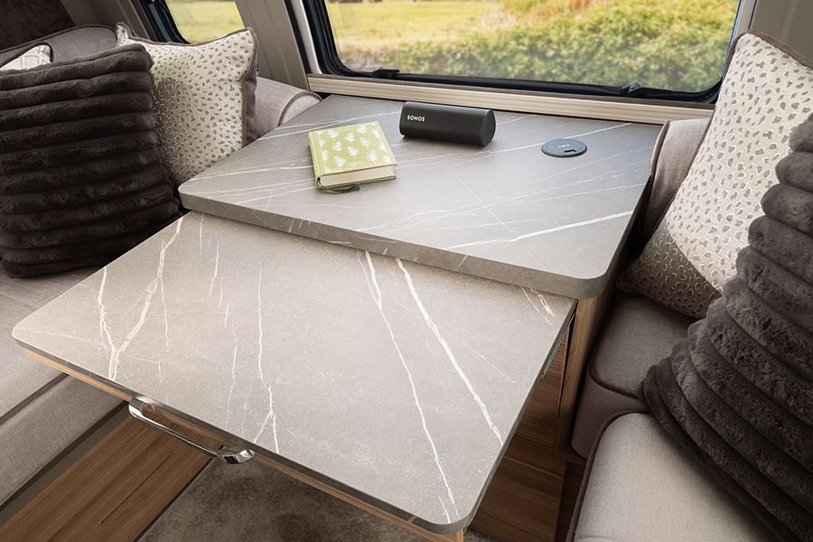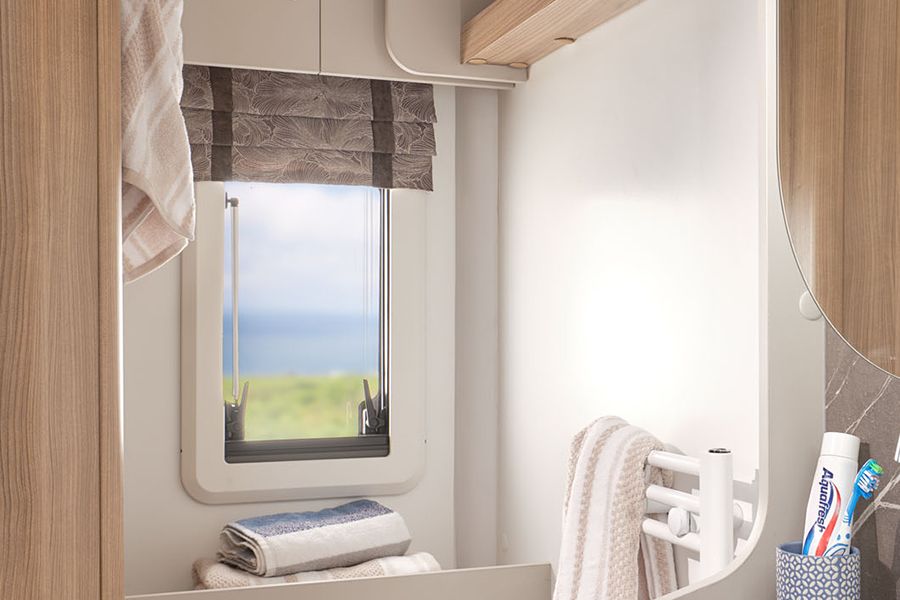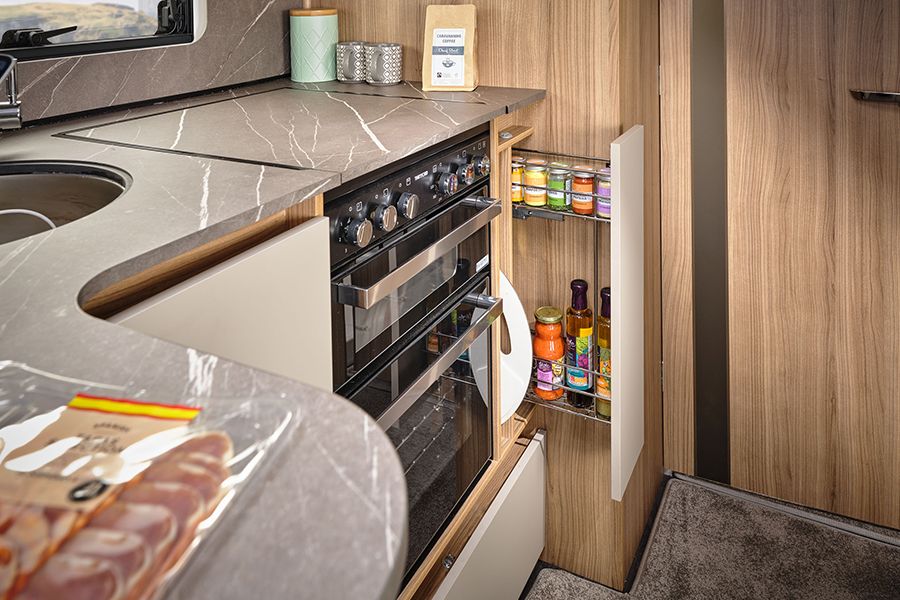 Ekstra tezgâh alanı ve depolama sunan L şeklinde mutfak; Thetford 137L kule tipi buzdolabı ile donatılmıştır