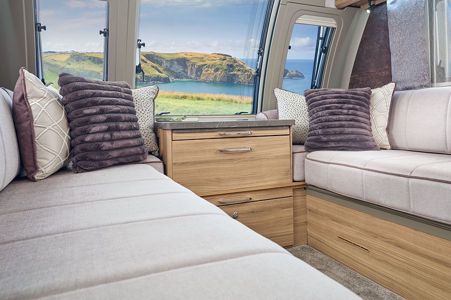 Ön salon, iki tek kişilik yatağa veya bir çift kişilik yatağa dönüşebilir; üç farklı kumaş seçeneği mevcuttur