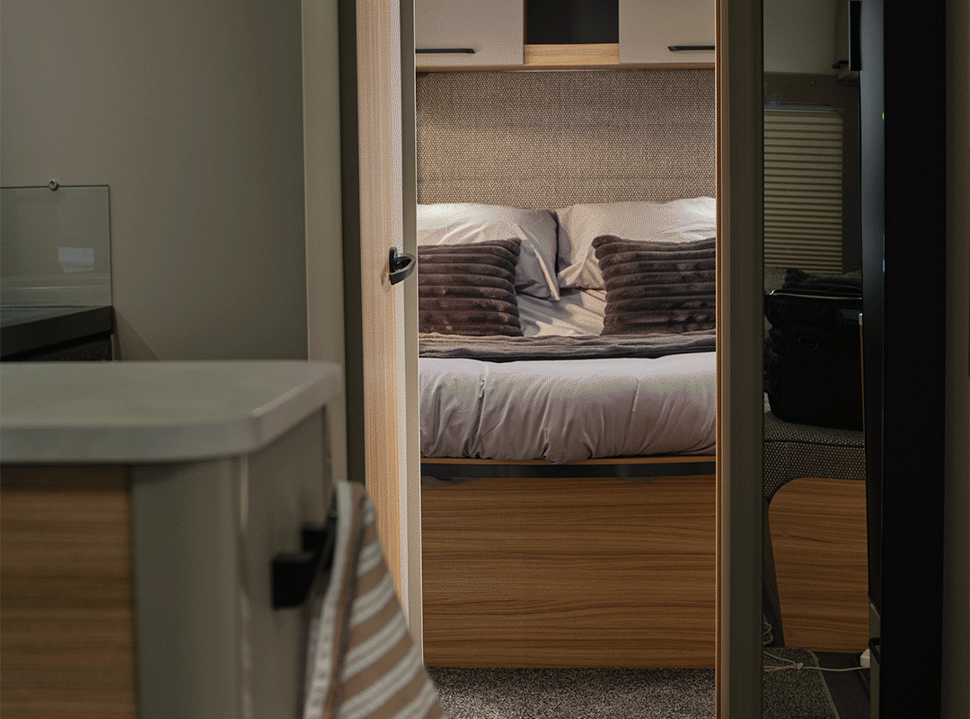 Çift akslı, 8 ft genişliğinde model; paralel oturma düzenine sahip ön salon ve arkada king size ada yatak ile 4 kişiye kadar uygun