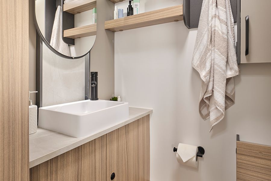 Geniş ön salon, iki tek kişilik yatağa veya bir çift kişilik yatağa dönüşebilir; üç farklı kumaş seçeneği mevcuttur