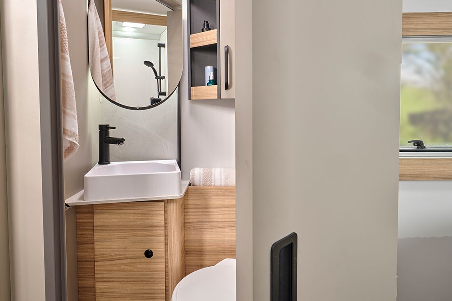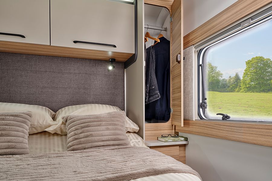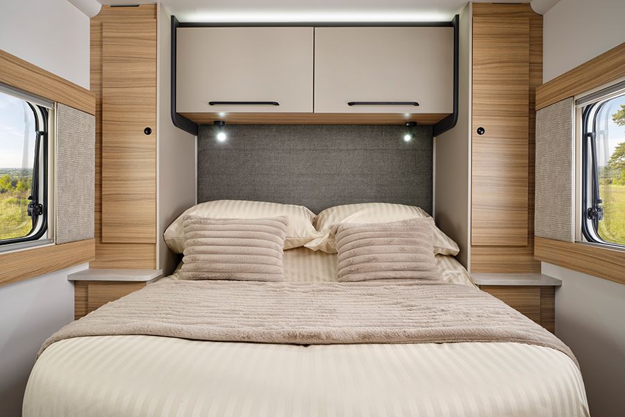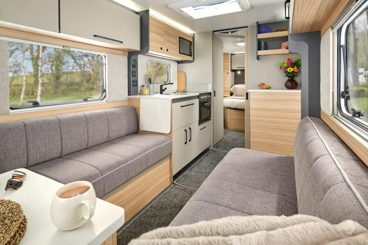 Tek aks, 7’3” genişliğinde model, paralel oturma düzenine sahip ön salon ve arka ada çift kişilik yatak ile 4 kişiye kadar kullanım imkânı sunar