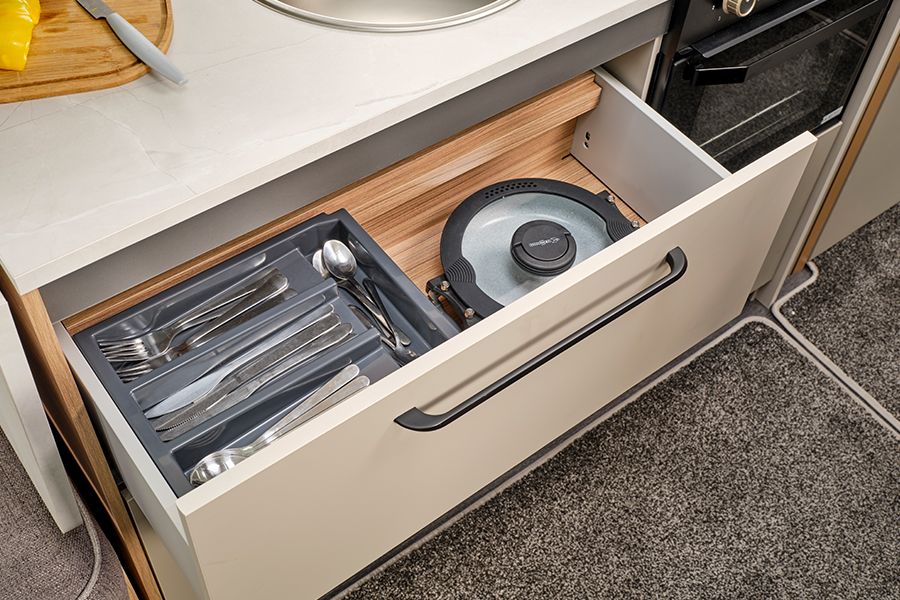 Alt dolap Dometic 92 litrelik buzdolabı + 12 litre dondurucu, üstünde ekstra tezgah alanı