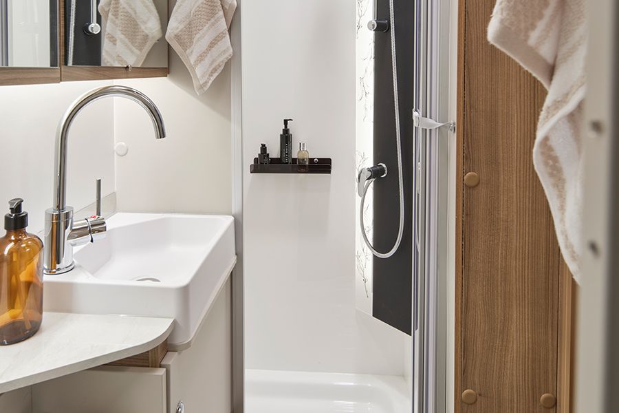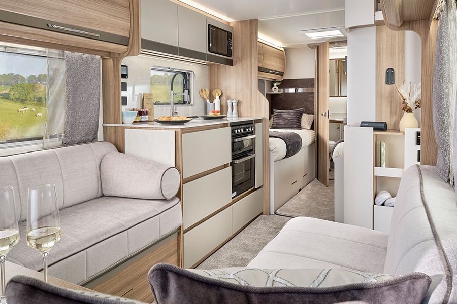 Thetford 137L kule tipi buzdolabına sahip tam donanımlı mutfak